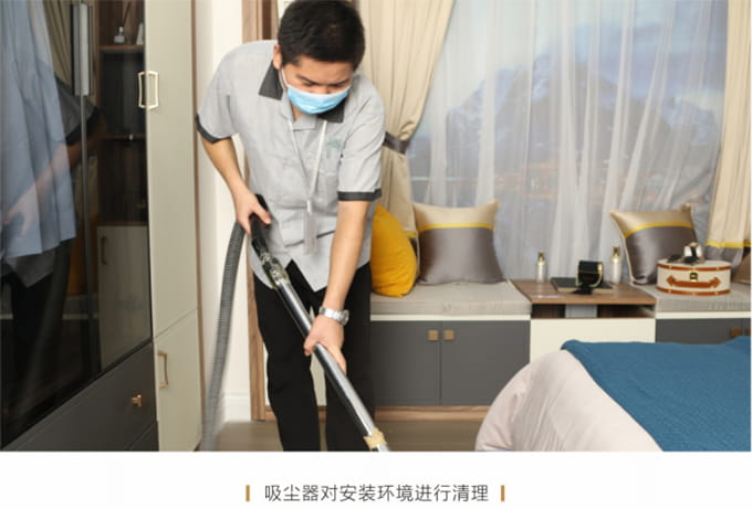 产品安装确认无误后及时清理房间内因安装产生的垃圾并保持空气流畅,然后用干净的抹布将家具擦拭一遍,确保产品清洁,用吸尘器对安装环境进行清理,并对所有安装好的产品拍摄记录作为完工效果备案。