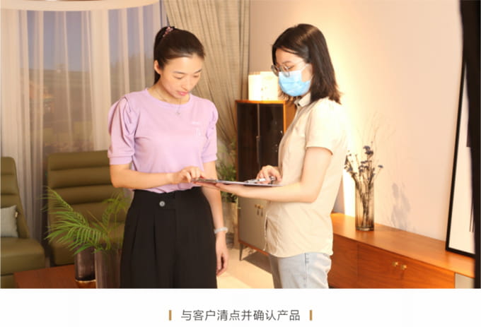 耐心解答客户提出的关于家具保养的提问,同时将乐鱼电竞产品使用说明书送给客户,尔后教客户如何扫描产品二维码进行防伪鉴定,请顾客对货物进行验收检查,然后正式签收《产品配送单》。