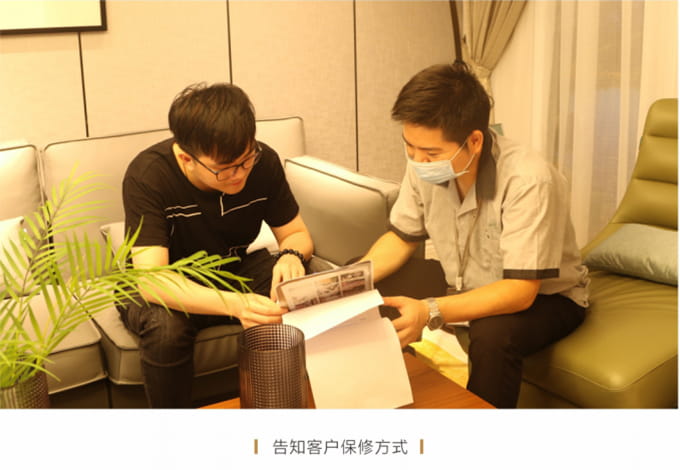产品处理完毕后必须一站式通检,指导客户使用,并将服务过程中产生的垃圾随手带走,家具维修完毕后,应用毛巾将家具擦拭一遍,确保产品清洁。