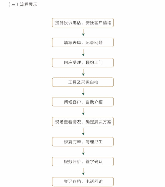 必须按照客户约定,至少提前5分钟上门,见到客户时需自我介绍,并出示上岗证和名片,在进入顾客家前应穿上自备的鞋套。征得客户同意后开始维修,严禁乱收费。